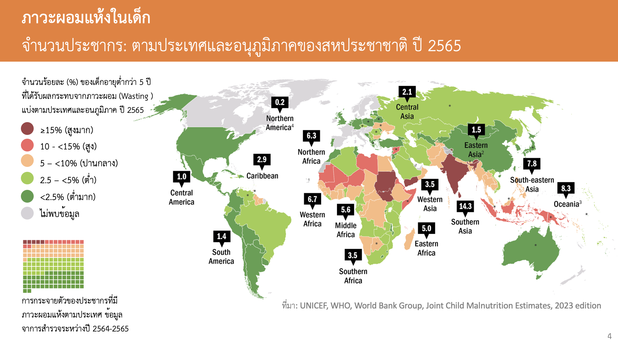 ข้อมูลในปี 2565 ของ UNICEF, WHO, World Bank Group แสดงจำนวน ประชากรเด็กที่อายุต่ำกว่า 5 ปี และมีภาวะผอม (Wasting) พบว่าเด็กที่อายุต่ำกว่า 5 ปีในประเทศไทย มีภาวะผอมอยู่ในระดับปานกลาง คือร้อยละ 5-10