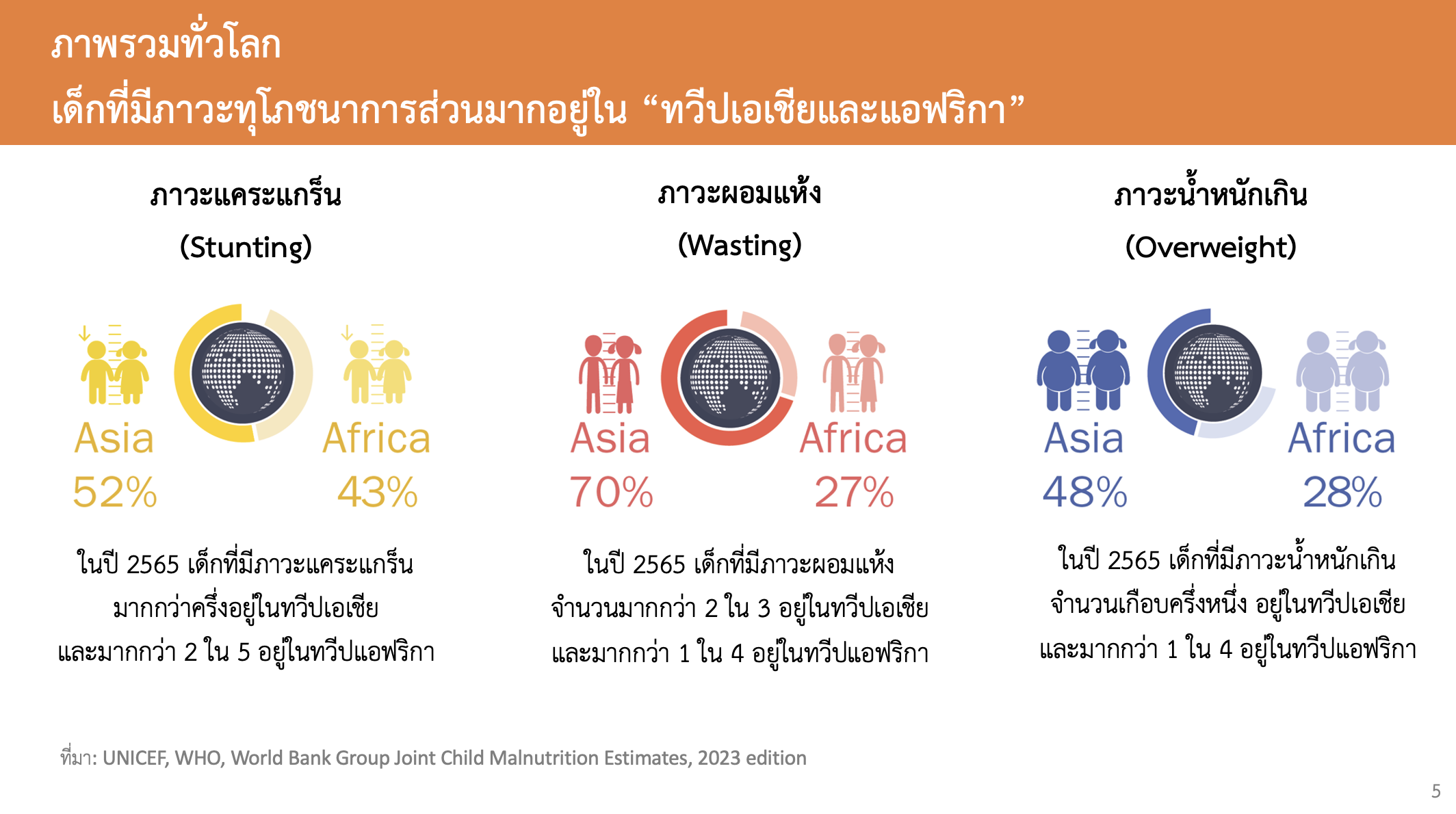 และในภาพรวมทั่วโลก พบว่า เด็กที่มีภาวะทุโภชนาการส่วนมาก อยู่ในทวีปเอเชียและแอฟริกา และตัวเลขที่น่าพิจารณา คือ เด็กที่มีภาวะผอมแห้งจำนวนมากกว่า 2 ใน 3 นั้นอยู่ในทวีปเอเชีย