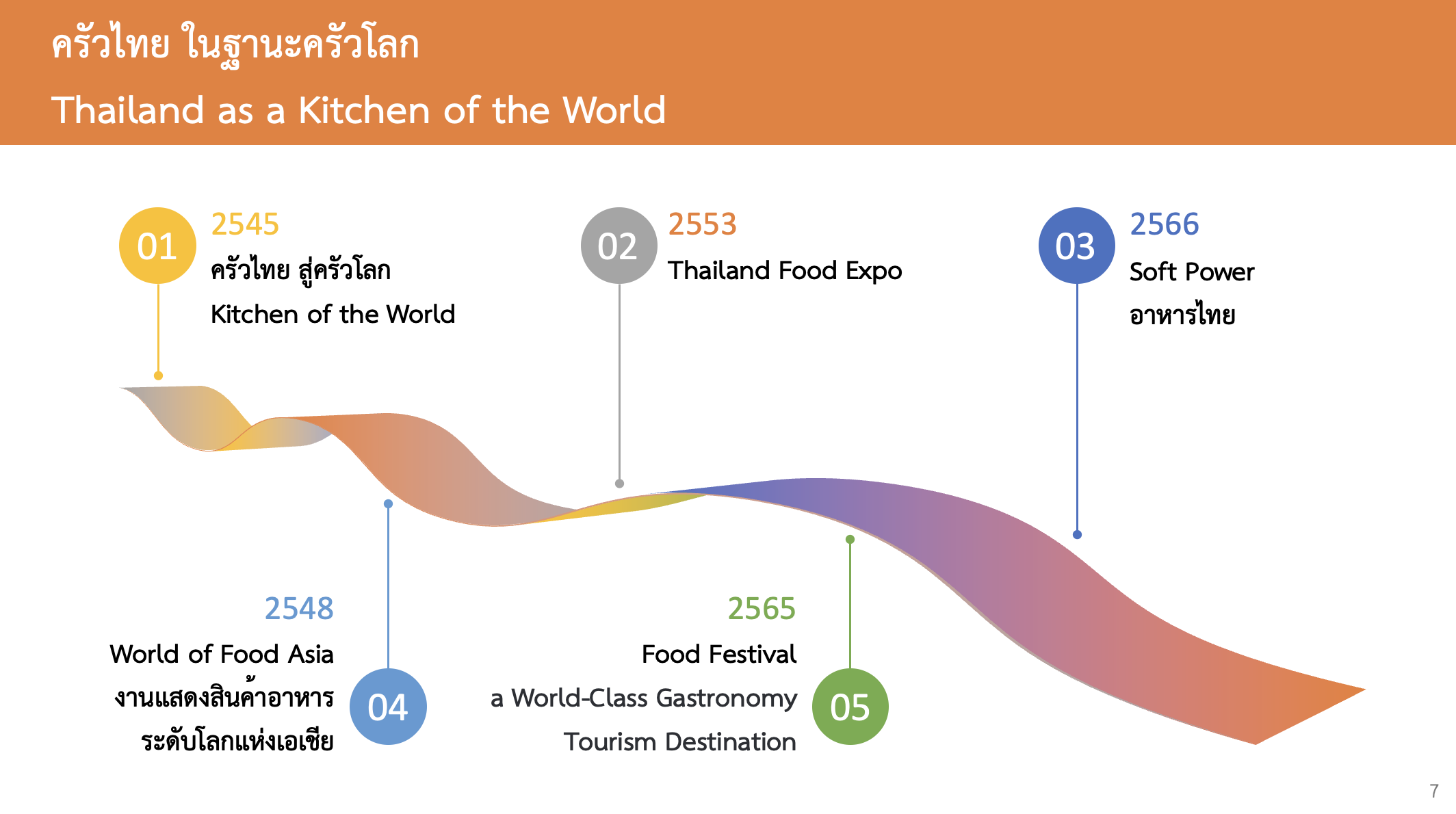 กว่า 2 ทศวรรษ ที่รัฐบาลมีนโยบายและเป้าหมายที่จะสร้างรายได้ และโอกาสการทำงานในภาคการเกษตรและอาหาร รวมถึงการเสริมสร้างชื่อเสียง ให้กับประเทศไทยในฐานะที่เป็น "ครัวของโลก" หรือ “Kitchen of the World”